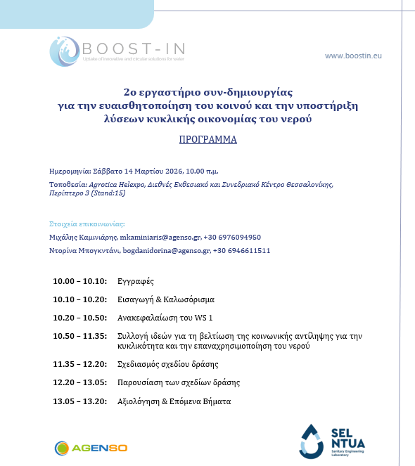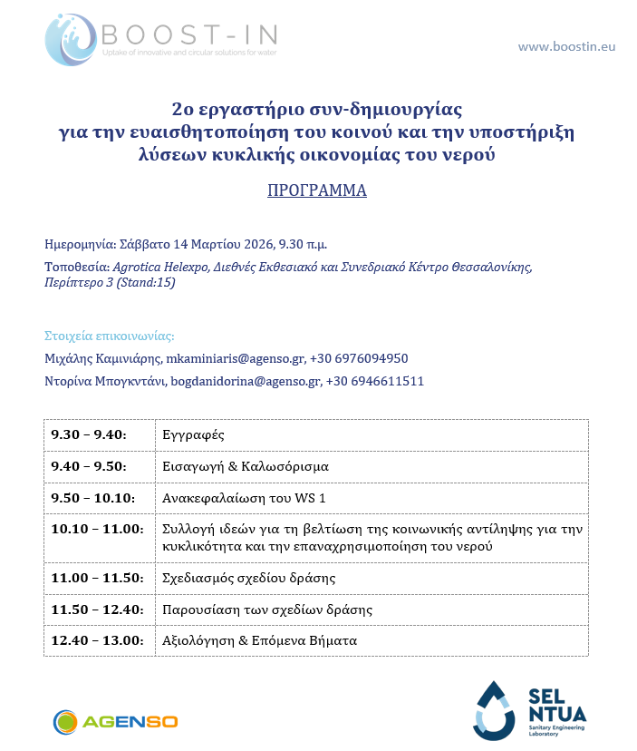We’re excited to invite you to the 2nd BOOST-IN workshop on "Raising public awareness and supporting circular water economy solutions", taking place during the Agrotica exhibition in Thessaloniki.